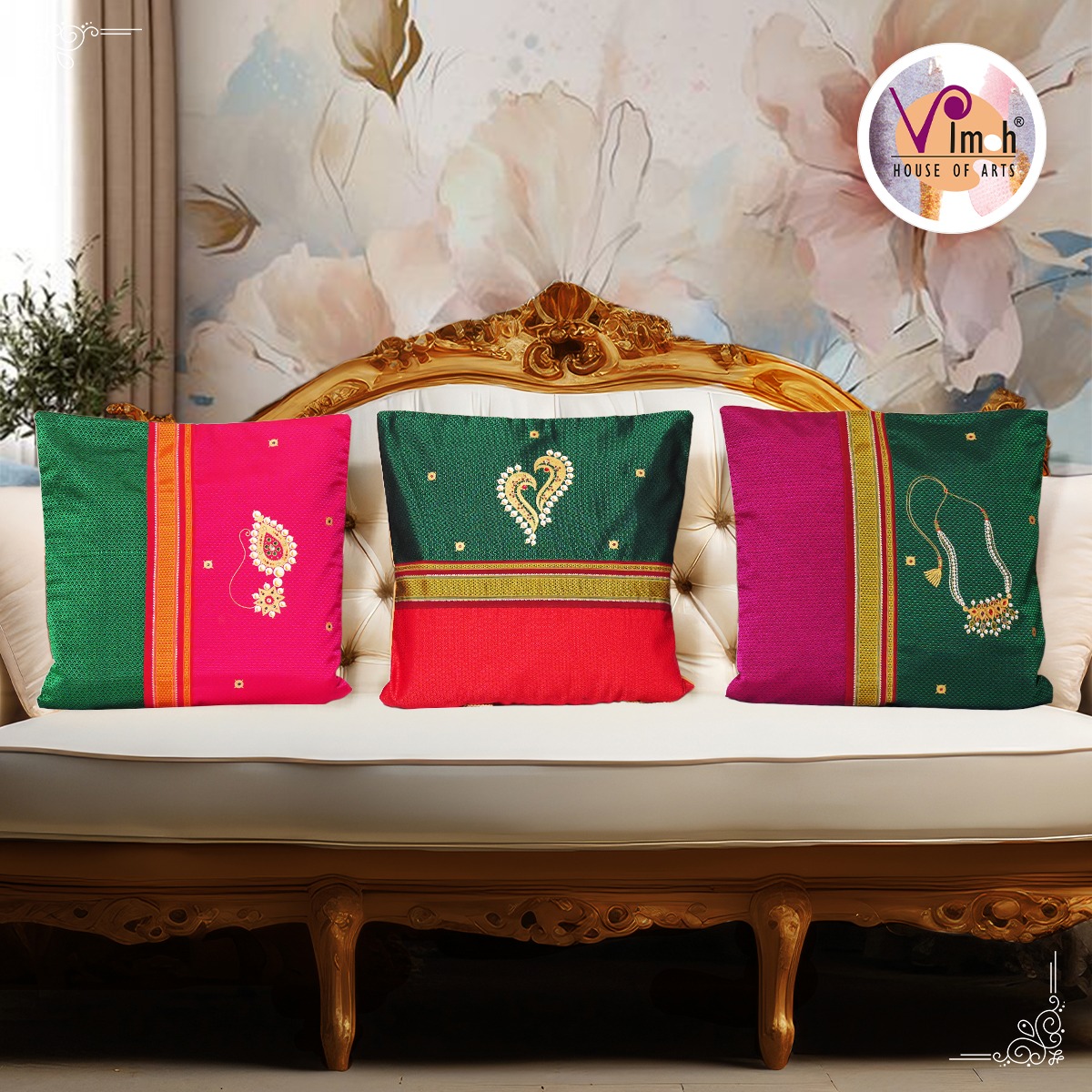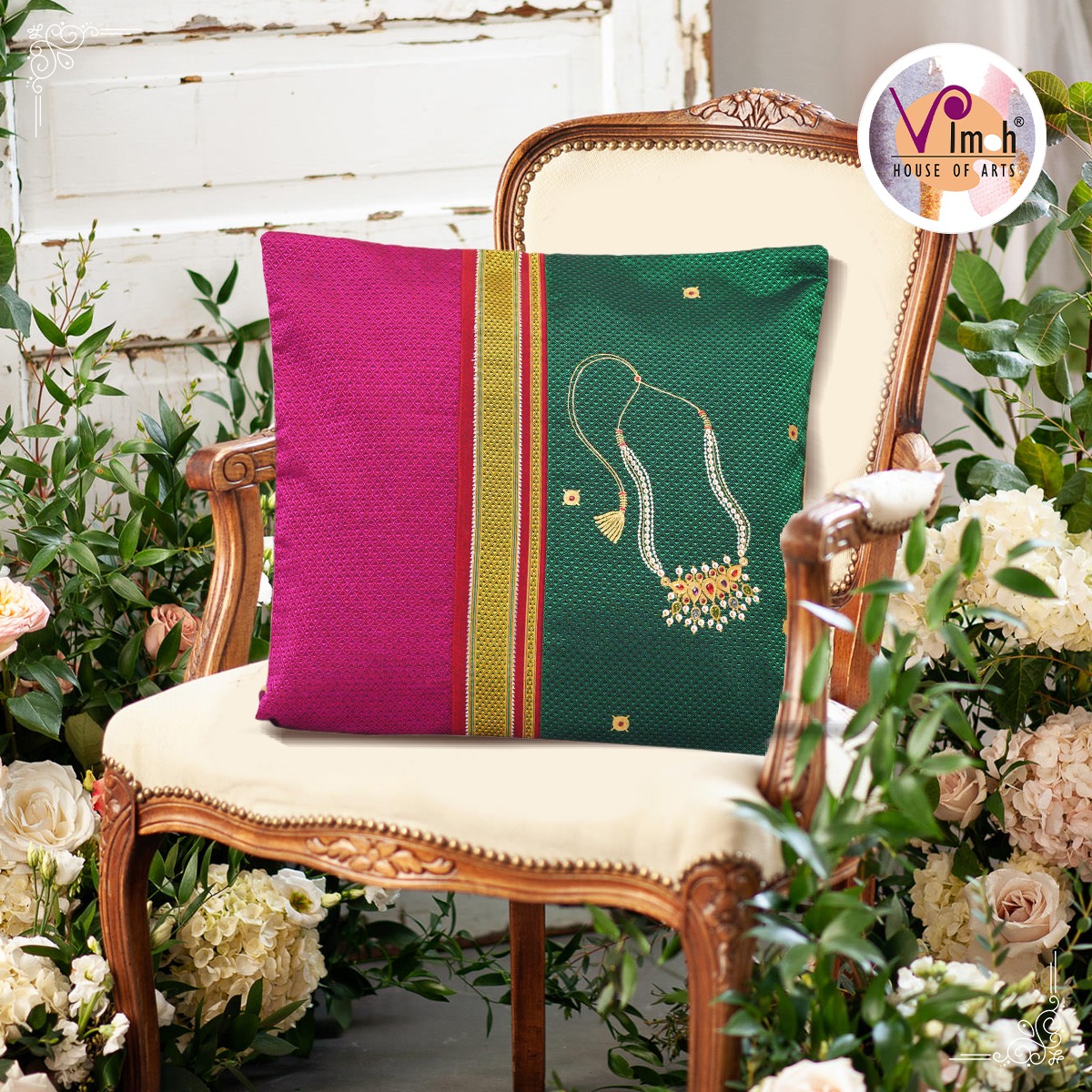 Timeless jewels hand painted on Ilkal border khunn cushion covers.