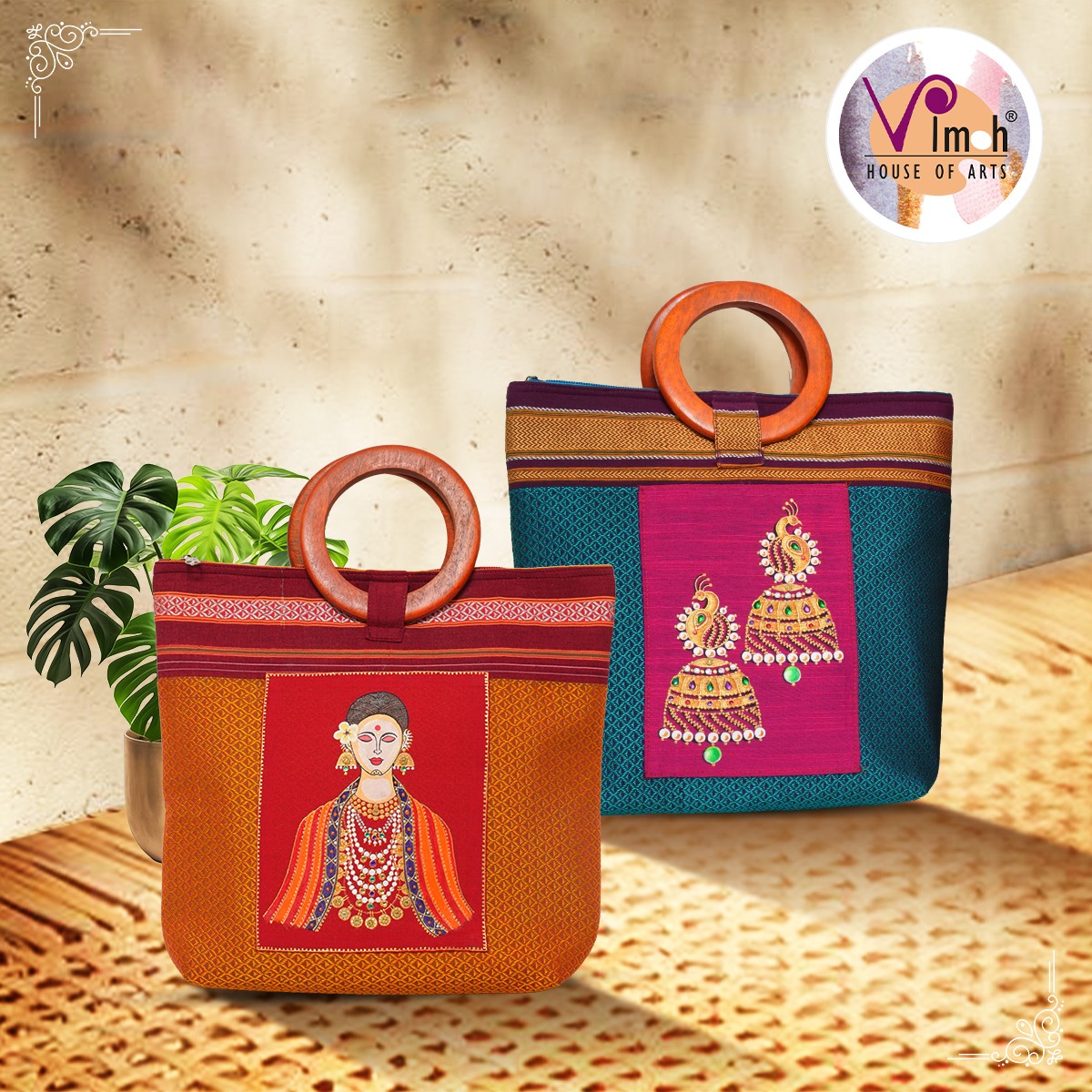 ’ portraits, these khunn hand purses come with either fabric or wooden handles.